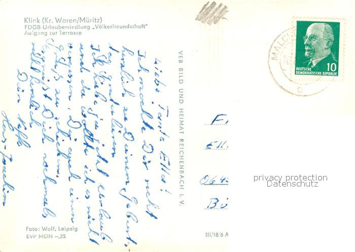 73095152 alte Postkarte Klink Waren FDGB Urlaubersiedlung Voelkerfreundschaft Aufgang Terrasse postalisch gelaufen Erhaltung siehe scans [KathaD81] KatCode: 11110013056030