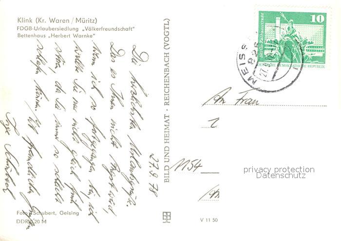 72984924 alte Postkarte Klink Waren FDGB Urlaubersiedlung Voelkerfreundschaft Bettenhaus Herbert Warnke postalisch gelaufen Erhaltung siehe scans [FriedD77] KatCode: 11110013056030