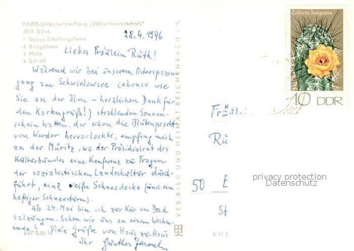 73741123 alte Postkarte Klink Waren FDGB-Urlaubersiedlung Voelkerfreundschaft Erholungsheim Bungalows Mole Schloss postalisch gelaufen Erhaltung siehe scans [LiesaD40] KatCode: 11110013056030