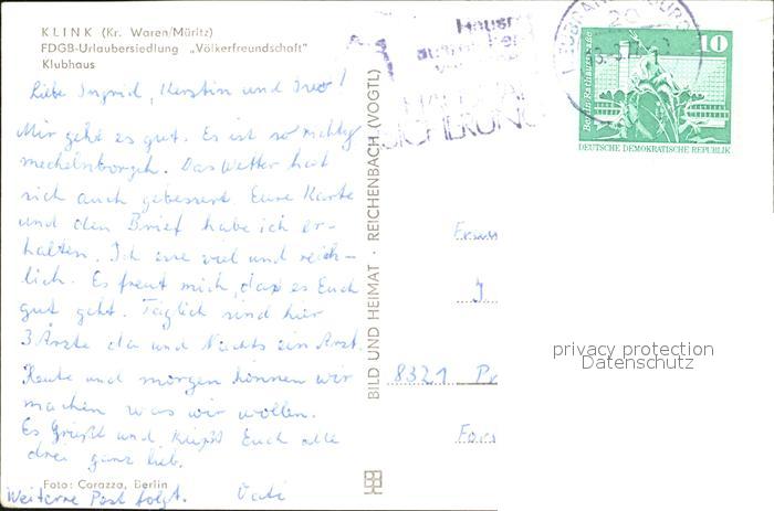 72446984 alte Postkarte Klink Waren FDGB Urlaubersiedlung Voelkerfreundschaft Klubhaus postalisch gelaufen Erhaltung siehe scans KatCode: 11110013056030