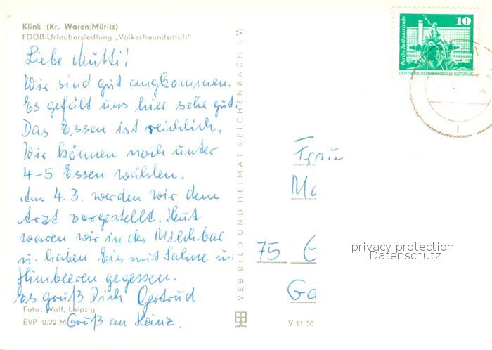 73753883 alte Postkarte Klink Waren FDGB Urlaubersiedlung Voelkerfreundschaft Strand Kulturgebaeude Bootspartie postalisch gelaufen Erhaltung siehe scans [FriedD77] KatCode: 11110013056030