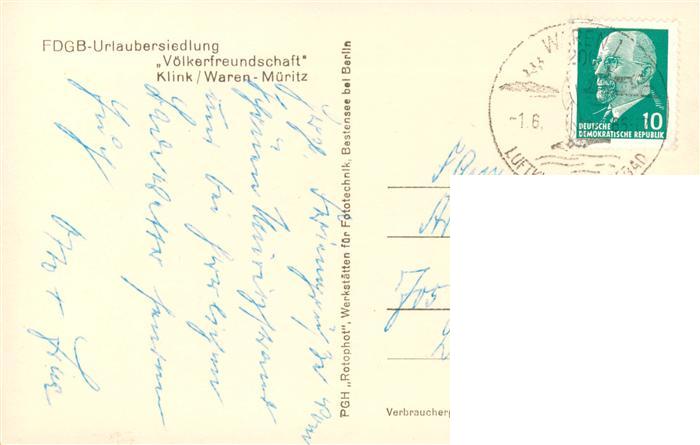 73898490 alte Postkarte Klink Waren FDGB Urlaubersiedlung Voelkerfreundschaft Zimmer postalisch gelaufen Erhaltung siehe scans [WerneD78] KatCode: 11110013056030