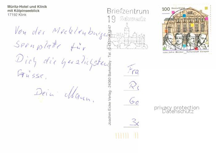 72863281 alte Postkarte Klink Waren Fliegeraufnahme Mueritz-Hotel mit Koelpinsee postalisch gelaufen Erhaltung siehe scans [LiesaD40] KatCode: 11110013056030
