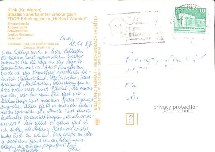 72331397 alte Postkarte Klink Waren Herbert Warnke Empfangshalle Schwimmhalle postalisch gelaufen Erhaltung siehe scans KatCode: 11110013056030