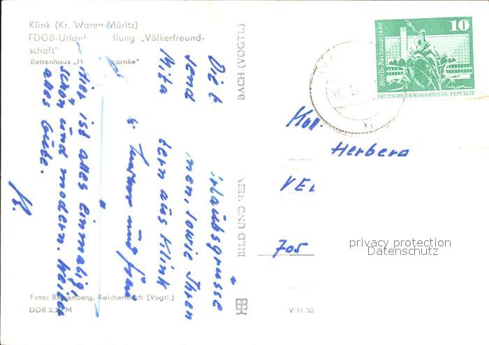 72395763 alte Postkarte Klink Waren Mueritz FDGB Urlaubserholung Voelkerfreundschaft postalisch gelaufen Erhaltung siehe scans KatCode: 11110013056030