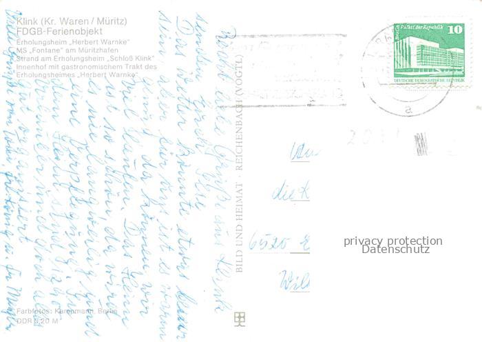 74087788 alte Postkarte Klink Waren Mueritz Mecklenburg-Vorpommern Erholungsheim Herbert Warnke MS Fontane Mueritzhafen Strand Schloss Klink Innenhof postalisch gelaufen Erhaltung siehe scans [WerneD78] KatCode: 11110013056030