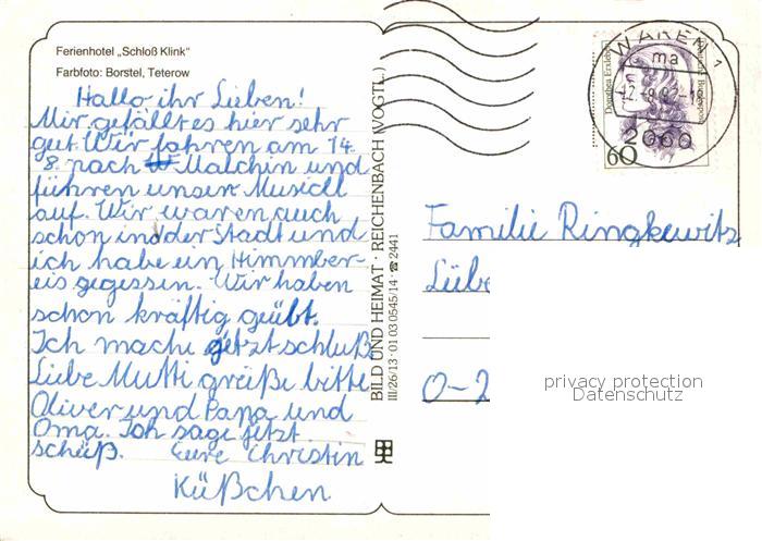 72846072 alte Postkarte Klink Waren Schloss Hotel postalisch gelaufen Erhaltung siehe scans [LiesaD40] KatCode: 11110013056030