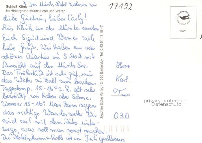 73157905 alte Postkarte Klink Waren Schloss im Hintergrund Mueritz Hotel und Waren Mecklenburgische Seenplatte Fliegeraufnahme postalisch gelaufen Erhaltung siehe scans [FriedD77] KatCode: 11110013056030