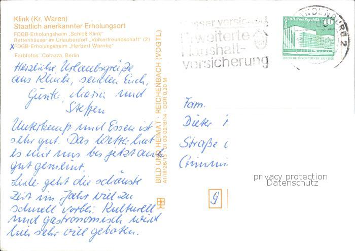 72292973 alte Postkarte Klink Waren Schloss Klink Erholungsheime postalisch gelaufen Erhaltung siehe scans KatCode: 11110013056030
