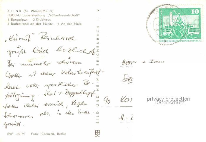 72831511 alte Postkarte Klink Waren Urlaubersiedlung V?lkerfreundschaft postalisch gelaufen Erhaltung siehe scans [LiesaD40] KatCode: 11110013056030
