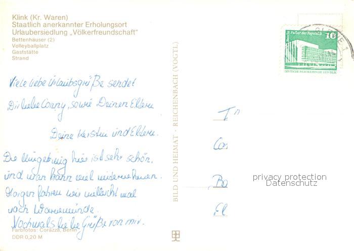 73295255 alte Postkarte Klink Waren Urlaubersiedlung Voelkerfreundschaft Bettenhaeuser Volleyballplatz Gaststaette Strand postalisch gelaufen Erhaltung siehe scans [WerneD78] KatCode: 11110013056030