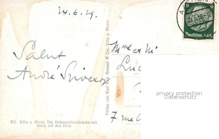 43489270 alte Postkarte K?ln Rhein Hohenzollernbr?cke mit Dom postalisch gelaufen Erhaltung siehe scans [LiesaD40] KatCode: