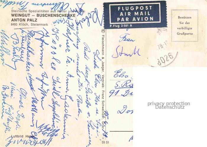 74155926 alte Postkarte Kloech Steiermark AT Weingut Buschenschenke Anton Palz postalisch gelaufen Fliegeraufnahme Erhaltung siehe scans [WerneD78] KatCode: 11390224061509