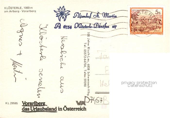 73316365 alte Postkarte Kloesterle Vorarlberg Ortsmotiv mit Kirche Partie am Fluss Gesamtansicht mit Alpenpanorama postalisch gelaufen Erhaltung siehe scans [FriedD77] KatCode: 11390341080112