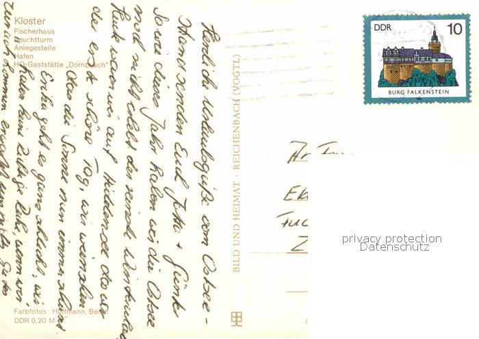 72616309 alte Postkarte Kloster Hiddensee Fischerhaus Leuchtturm Anlegestelle Hafen HO Gaststaette Dornbusch postalisch gelaufen Erhaltung siehe scans [FriedD77] KatCode: 11110013061017