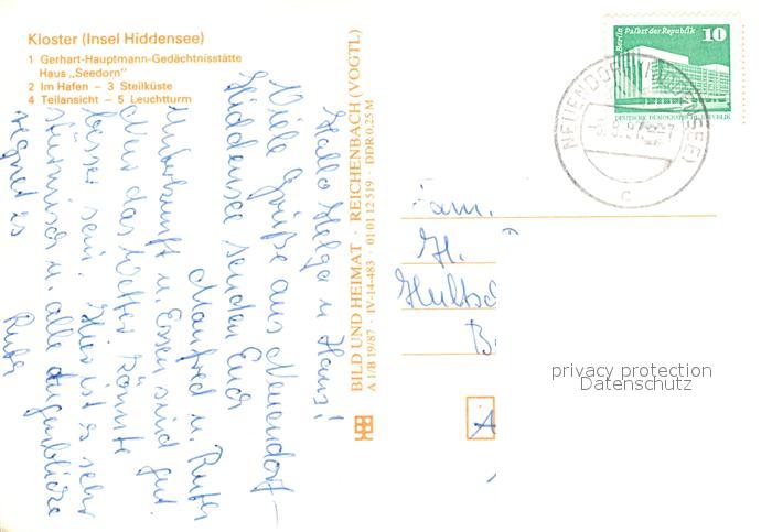 73044972 alte Postkarte Kloster Hiddensee Gerhart Hauptmann Gedaechtnisstaette Haus Seedorn Im Hafen Steilkueste Teilansicht Leuchtturm postalisch gelaufen Erhaltung siehe scans [WerneD78] KatCode: 11110013061017