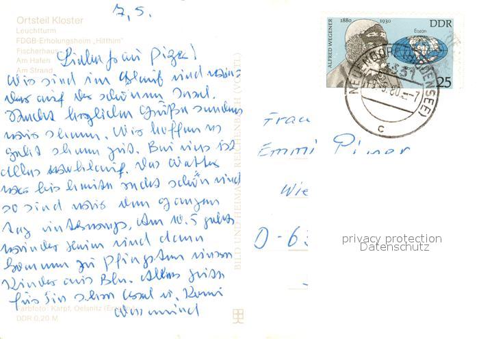 73226709 alte Postkarte Kloster Hiddensee Leuchtturm FDGB Erholungsheim Hitthim Fischerhaus Hafen Strand postalisch gelaufen Erhaltung siehe scans [FriedD77] KatCode: 11110013061017