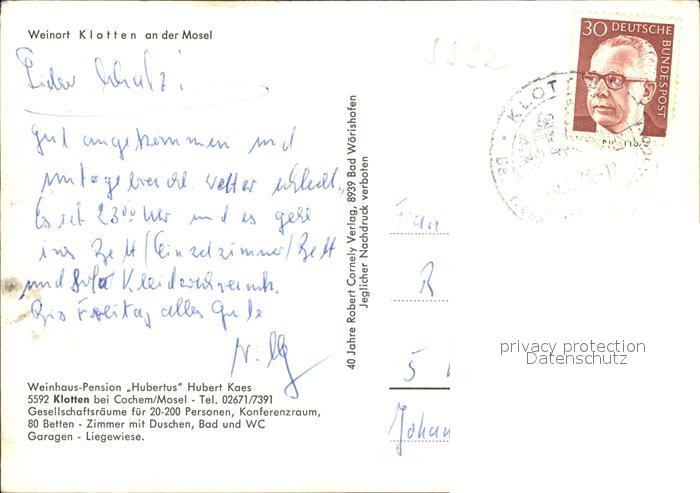72450648 alte Postkarte Klotten Panorama Fachwerkhaus postalisch gelaufen Erhaltung siehe scans KatCode: 11110007135049