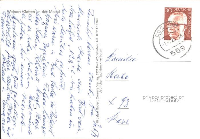 72370232 alte Postkarte Klotten Weinort Mosel postalisch gelaufen Erhaltung siehe scans KatCode: 11110007135049