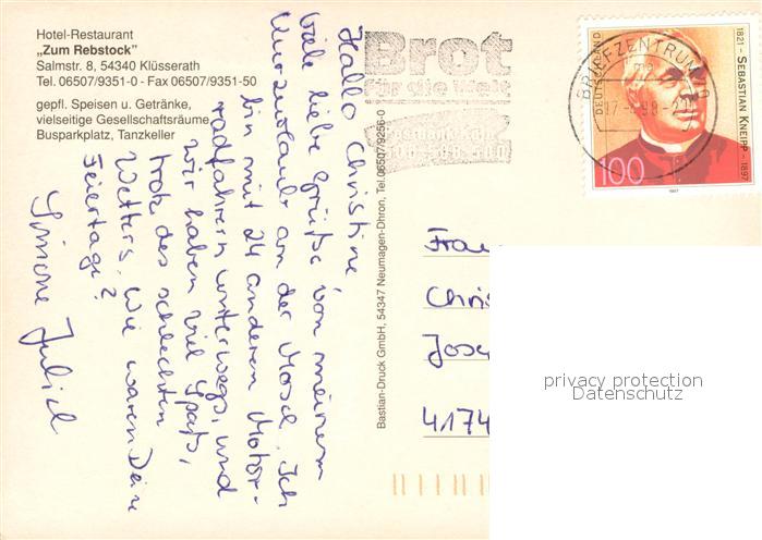 73670057 alte Postkarte Kluesserath Panorama Weinort an der Mosel Weinberge Kirche Statue Denkmal postalisch gelaufen Erhaltung siehe scans [FriedD77] KatCode: 11110007235063
