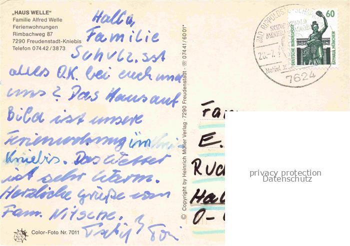 74101036 KNIEBIS Freudenstadt Gaestehaus Haus Welle Ferienwohnungen im Schwarzwald postalisch gelaufen Erhaltung siehe scans [FriedD77] alte Postkarte Frie Katcode 11110008237028