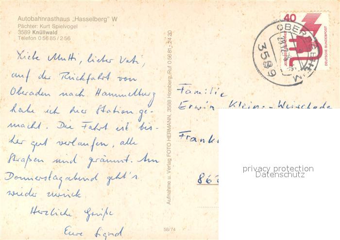 73720357 alte Postkarte Knuellwald Autobahnrasthaus Hasselberg Restaurant postalisch gelaufen Erhaltung siehe scans [FriedD77] KatCode: 11110006634011