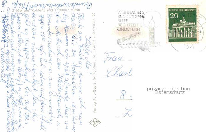 72840752 alte Postkarte Koblenz Rhein Am Plan Moselbruecke Weindorf Deutschherrenhaus Deutsches Eck Schloss Festung Ehrenbreitstein bei Nacht postalisch gelaufen Erhaltung siehe scans [FriedD77] KatCode: 11110007111000