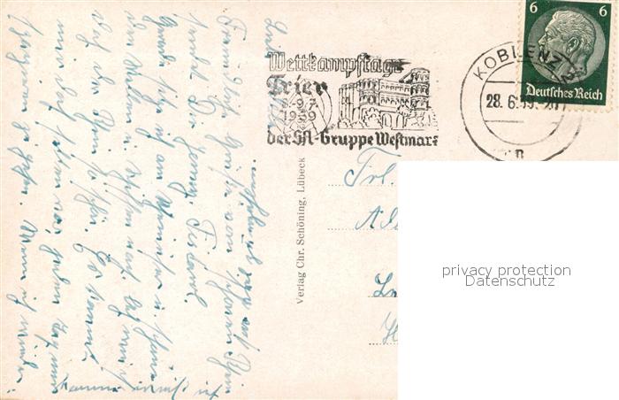 73369643 alte Postkarte Koblenz Rhein Blick von der Festung Ehrenbreitstein drei Rheinbruecken postalisch gelaufen Erhaltung siehe scans [KathaD81] KatCode: 11110007111000