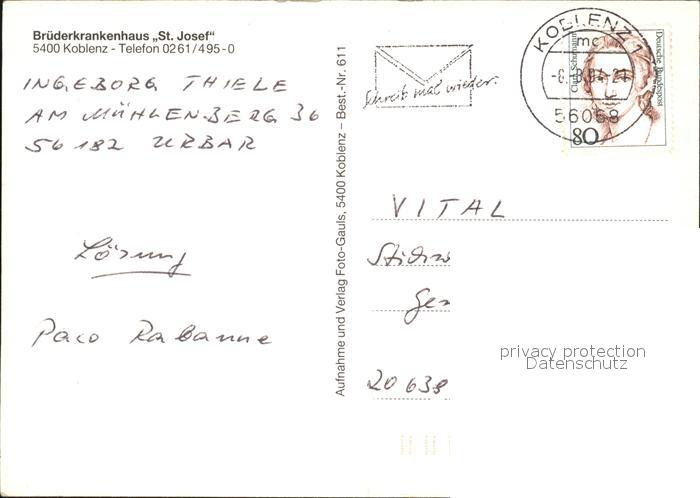 72495603 alte Postkarte Koblenz Rhein Bruederkrankenhaus St. Josef postalisch gelaufen Erhaltung siehe scans KatCode: 11110007111000