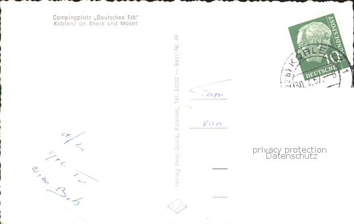 72088773 alte Postkarte Koblenz Rhein Camping Deutsches Eck postalisch gelaufen Erhaltung siehe scans KatCode: 11110007111000