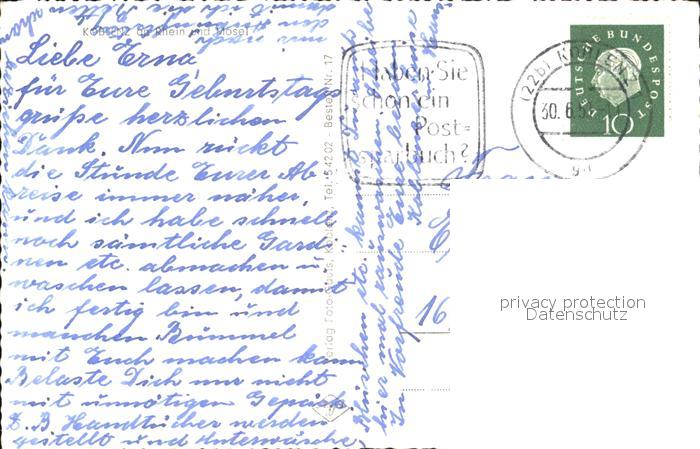 alte Postkarte Koblenz Rhein Deutsches Eck Rheinanlagen Schloss Blumenhof Festung Ehrenbreitstein Weindorf postalisch gelaufen Erhaltung siehe scans