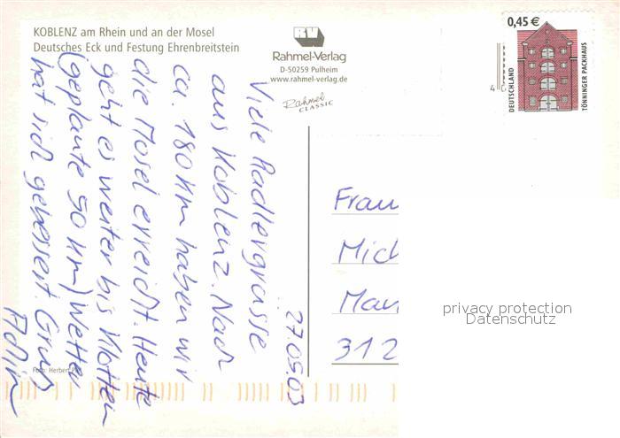72786167 alte Postkarte Koblenz Rhein Deutsches Eck und Festung Ehrenbreitstein Fliegeraufnahme postalisch gelaufen Erhaltung siehe scans [FriedD77] KatCode: 11110007111000