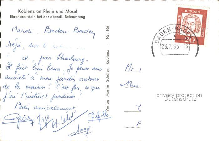72062938 alte Postkarte Koblenz Rhein Ehrenbreitstein bei abendlicher Beleuchtung postalisch gelaufen Erhaltung siehe scans KatCode: 11110007111000