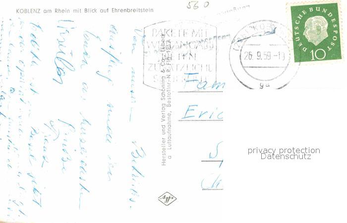 72884481 alte Postkarte Koblenz Rhein Ehrenbreitstein Fliegeraufnahme postalisch gelaufen Erhaltung siehe scans [PaolaD17] KatCode: 11110007111000