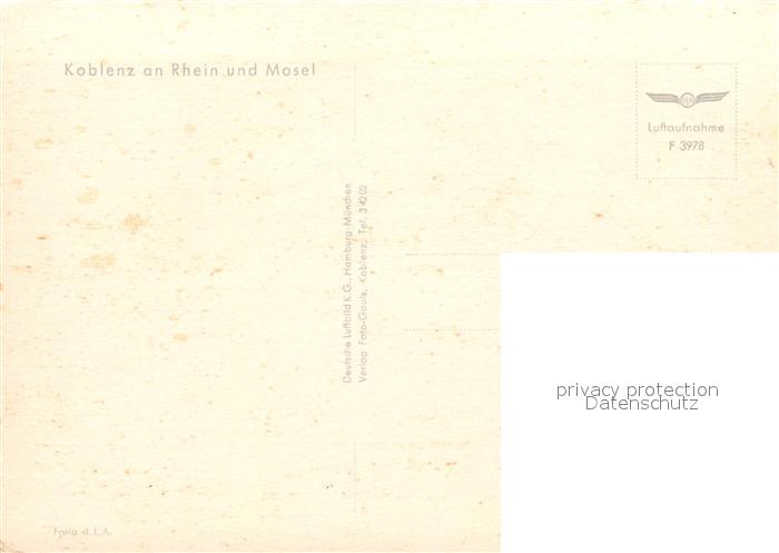 72971353 Koblenz Rhein Festung Ehrenbreitstein Moselmuendung Deutsches Eck Fliegeraufnahme postalisch nicht gelaufen Erhaltung siehe scans [FriedD77] KatCode: 11110007111000