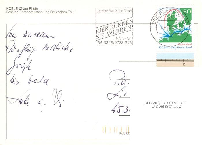 72964749 alte Postkarte Koblenz Rhein Festung Ehrenbreitstein und Deutsches Eck Fliegeraufnahme postalisch gelaufen Erhaltung siehe scans [FriedD77] KatCode: 11110007111000