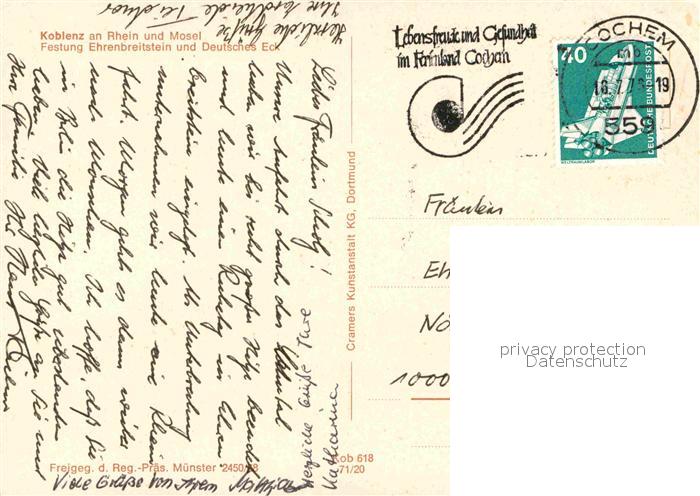 72892564 alte Postkarte Koblenz Rhein Fliegeraufnahme Festung Ehrenbreitstein Deutsches Eck postalisch gelaufen Erhaltung siehe scans [AndreD76] KatCode: 11110007111000