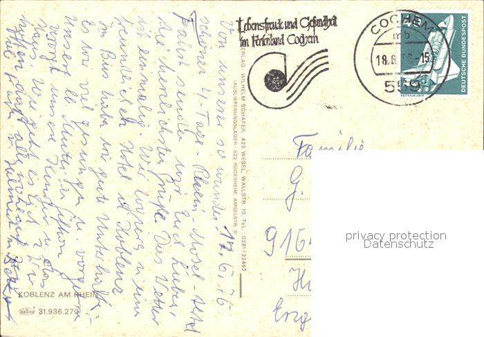 72364923 alte Postkarte Koblenz Rhein Fliegeraufnahme mit Burgen Deutsches Eck postalisch gelaufen Erhaltung siehe scans KatCode: 11110007111000