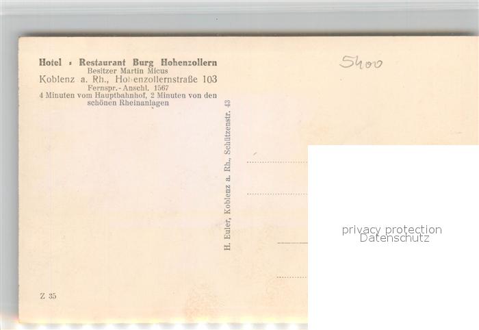 42975837 Koblenz Rhein Hotel Restaurant Burg Hohenzollern postalisch nicht gelaufen Erhaltung siehe scans [KathaD81] KatCode: 11110007111000