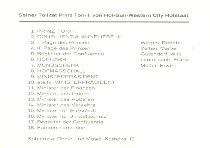 73885774 Koblenz Rhein Karneval 1973 Karnevalstruppe Akteure postalisch nicht gelaufen Erhaltung siehe scans [FriedD77] KatCode: 11110007111000