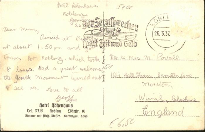 40931127 Koblenz Rhein Koblenz Hotel Restaurant Hoehenhaus postalisch gelaufen Alte Ansichtskarte Postkarte alte Postkarte Katcode 11110007111000
