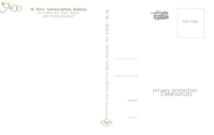 73695359 Koblenz Rhein Operette auf dem Rhein Der Bettelstudent postalisch nicht gelaufen Erhaltung siehe scans [WerneD78] KatCode: 11110007111000