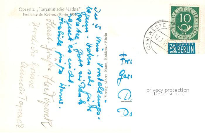 73762474 alte Postkarte Koblenz Rhein Operette Florentinische Naechte Freilichtspiele postalisch gelaufen Erhaltung siehe scans [LiesaD40] KatCode: 11110007111000