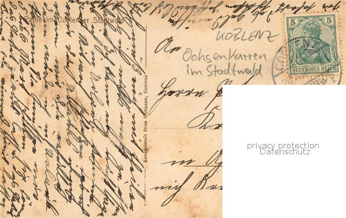 73706614 alte Postkarte Koblenz Rhein Partie im Coblenzer Stadtwald mit Ochsenkarren postalisch gelaufen Erhaltung siehe scans [WerneD78] KatCode: 11110007111000