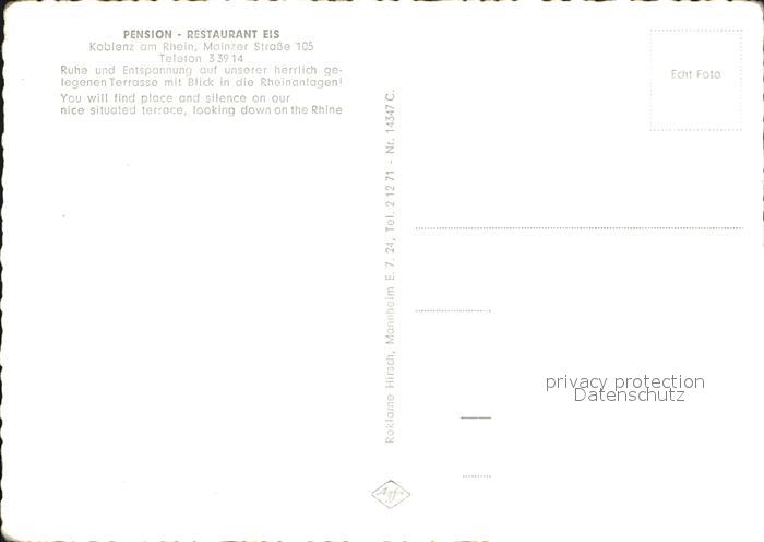 72393204 Koblenz Rhein Pension Restaurant Eis postalisch nicht gelaufen Erhaltung siehe scans KatCode: 11110007111000