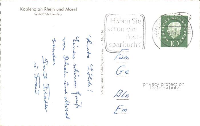 71930286 alte Postkarte Koblenz Rhein Schloss Stolzenfels postalisch gelaufen Erhaltung siehe scans KatCode: 11110007111000