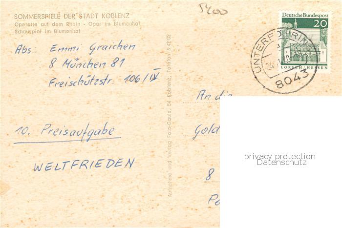 73835135 alte Postkarte Koblenz Rhein Sommerspiele Operette auf dem Rhein Oper und Schauspiel im Blumenhof postalisch gelaufen Erhaltung siehe scans [WerneD78] KatCode: 11110007111000