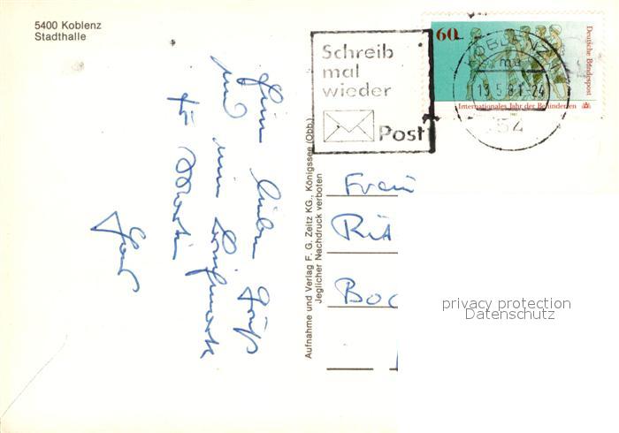 72958388 alte Postkarte Koblenz Rhein Stadthalle postalisch gelaufen Erhaltung siehe scans [NatalD47] KatCode: 11110007111000