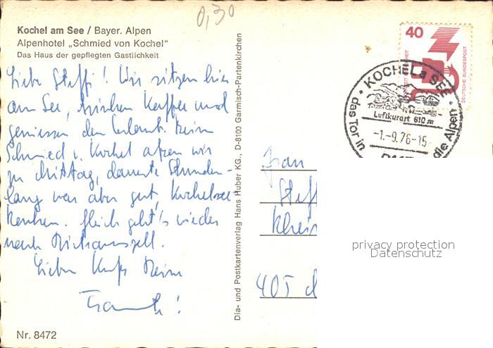 72526649 alte Postkarte Kochel See Alpenhotel Schmied vom See postalisch gelaufen Erhaltung siehe scans KatCode: 11110009173133
