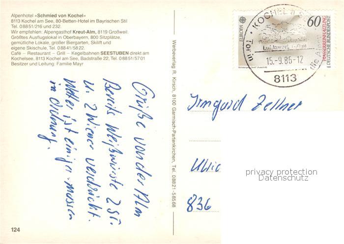73107340 alte Postkarte Kochel See Alpenhotel Schmied von Kochel postalisch gelaufen Erhaltung siehe scans [NatalD47] KatCode: 11110009173133